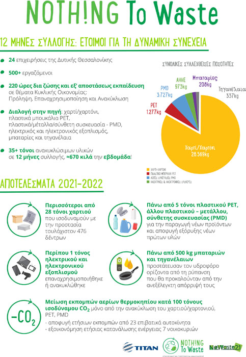 Παράλληλα, στο πλαίσιο του προγράμματος, εκπαιδεύτηκαν πάνω από 500 εργαζόμενοι των επιχειρήσεων αυτών στην κυκλική οικονομία, το μόνο μοντέλο αξιοποίησης των φυσικών πόρων που μπορεί να συμβάλει αποτελεσματικά στο όραμα για έναν βιώσιμο πλανήτη. Μέσα από αυτό το πρωτοποριακό έργο πρόληψης, επαναχρησιμοποίησης και ανακύκλωσης αναδεικνύονται τα πλεονεκτήματα των συνεργειών ανάμεσα σε ιδιωτικούς φορείς και ωφελείται σε μέγιστο βαθμό η τοπική κοινωνία, σε οικονομικό, περιβαλλοντικό και κοινωνικό επίπεδο. Η πρωτοβουλία και χρηματοδότηση της δράσης Nothing to Waste προέρχεται από το εργοστάσιο ΤΙΤΑΝ Ευκαρπίας.